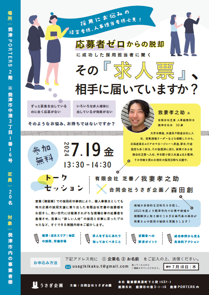 「ずっと求人を出しているのに応募が来ない」「複数の求人媒体を使っても効果が出ない」そんな採用の悩みに対し、応募者ゼロから脱却するための実践的な求人票づくりをテーマにした合同会社うさぎ企画の代表、森田氏とのトークセッション。